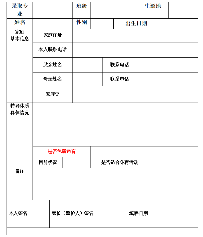 填表说明:为了关爱学生,确保学生的身心健康,学院建立特异体质学生档案,便于辅导员、体育教师或者其他相关人员对有特异体质或特殊疾病学生的身体近况做好全面了解,使特异体质学生无论在学习、课外活动还是在日常生活中都能得到及时的帮助与照顾,有利于他们的健康成长。同时,学校将对有特异体质学生的情况做好保密工作。请每位学生及家长要认真负责填写特异体质学生调查登记表,做到实事求是。