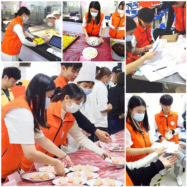 本次比赛按照第四届上海高校食堂厨艺技能大赛的标准和赛制进行,分白案和红案两大项目,其中白案比赛指定品种为鲜肉包、菜包及2个自选创新点心;红案比赛指定品种为“青椒土豆丝”和2个自选创新菜肴;每家餐饮公司打造人气美食2种。来自徐汇、浦东两校区3家餐饮公司,上海汇美堂餐饮管理有限公司、上海学校餐饮服务有限公司、上海颐谷餐饮管理有限公司的多名点心师、厨师参加了比赛。参赛选手们严格按照比赛规程和操作规范,全身心投入,匠心独具,以娴熟的刀工及独特的创新,纷纷亮出自己的绝活,展示自己的精湛厨艺。活动现场志愿者学生们也积极参与筹备活动中,签到、测体温、摆盘、分发评分表、统计选票……他们忙碌的身影也会大赛活动增添了靓丽的色彩。