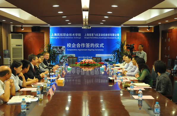 继5月9日隆重成立“上海民航职业技术学院”后,学院校企合作建设步伐跨出闪亮的第一步。2012年5月25日下午,上海民航职业技术学院代表于再和上海普惠飞机发动机维修有限公司(以下简称普惠公司)总经理Michael L Eller代表双方隆重签署校企合作协议,共同培育合格普惠人才。此举是双方继3月成功洽谈以来的成果延伸,奏响了学院与普惠公司未来全面合作的序曲。见证这一历史时刻的有:力促合作成功的推动者——民航上海安全监督管理局适航维修处副处长朱海雷、主任科员史春;普惠公司总经理Michael L Eller、修理部经理Andrew Renwick、发动机运营部经理徐宗助;学院代表于再、副院长孙暄,市场部主任倪轶群、工程系副主任罗玉梅以及教务处副处长陆周等。