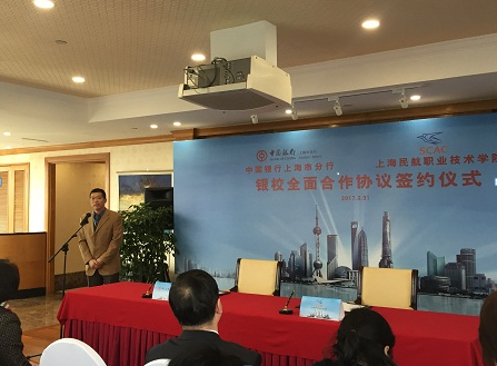 王琛副行长在致辞中对学院一直以来对中国银行的信任和支持表示感谢,对学院在人才培养、民航发展、社会服务等诸多方面的社会贡献给与了高度评价。王行长指出,中行和学院在追求卓越、诚信至上、开放创新等方面有很多共通点,有深厚的合作基础。她相信中行将会继续秉持以客户为中心的经营理念,执行以学费代缴、高校奖助勤贷、校园一卡通等项目为主的一揽子方案,打造高效贴心的民航学院金融服务,力推学院发展,银校牵手合作,共创美好未来。