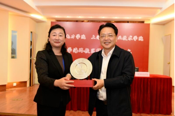 签约仪式由上海电力学院副院长封金章主持,他首先介绍了双方出席的主要领导和前期开展相关工作的情况。大会随后进入了激动人心的签约环节:我院于再院长和电力学院李和兴院长代表双方单位在《上海电力学院学海路校区土地、房屋转让合同》上签字,我院与电力学院全体院领导走上签约台,共同见证这一历史性的时刻并合影留念,全场响起了热烈的掌声。我院孙莹书记向电力学院赠送了印有院名标识的B777模型飞机,电力学院李明福书记回赠了铭刻该校校训和标志性建筑的摆盘以资纪念。
