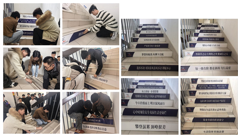 随后,师生们共同投入到楼梯间宣传标语粘贴工作中。此次上墙的标语内容丰富且贴合学生生活,既包含从学生中征集的、充满青春气息的校园生活感悟,也摘录了《学生手册》中规范行为的关键内容,更融入了民航精神与安全意识相关内容。让每一条标语都成为看得见、记在心的“成长指南”。