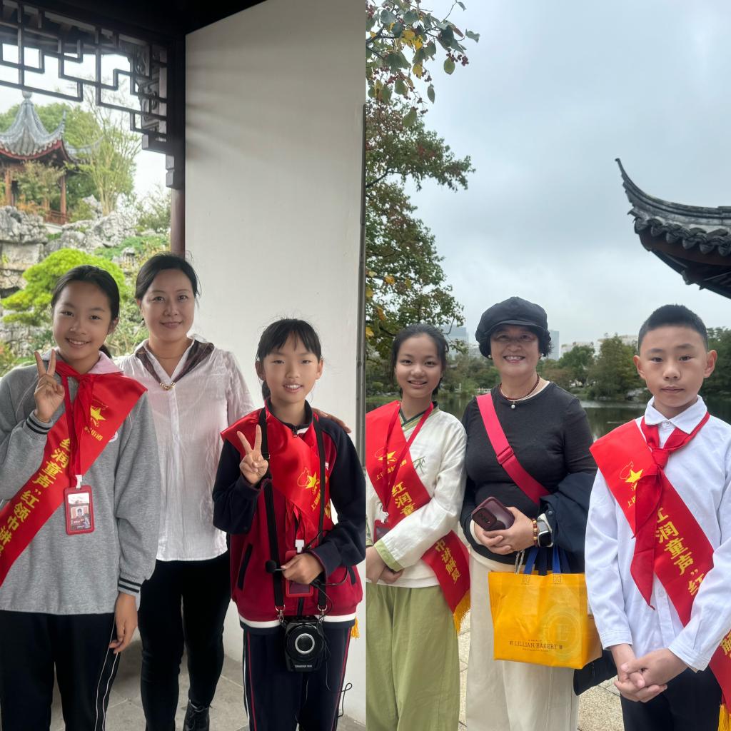 公园内,老师们巧遇来自洪山街道组织的中学生义务讲解员。孩子们认真细致的讲解、端庄大方的仪态举止吸引了大家的关注,并得到了大家的高度赞誉。鲜艳的红领巾映衬着孩子们明媚的笑脸,如同绽放的花儿行走在这古色古香的江南园林之中,阳光灿烂,朝气蓬勃,让人忍不住想起梁启超的那句名言“少年强则国强,少年智则国智,少年富则国富”。美哉,中国少年!