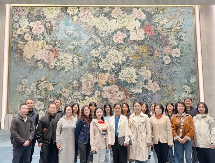 该公司职员、我校毕业生代表古逸航同学热情欢迎老师们的到访,引领大家参观了会客厅相关主题场馆并对馆内以马赛克热熔工艺制作的《满园春色》、锦绣厅的巨幅中国画、艺术家丁艺的代表作《十字2021-8》等艺术作品进行详细讲解,充分展示了世界会客厅在融合艺术、人文与现代服务理念方面的创新实践。