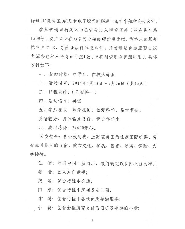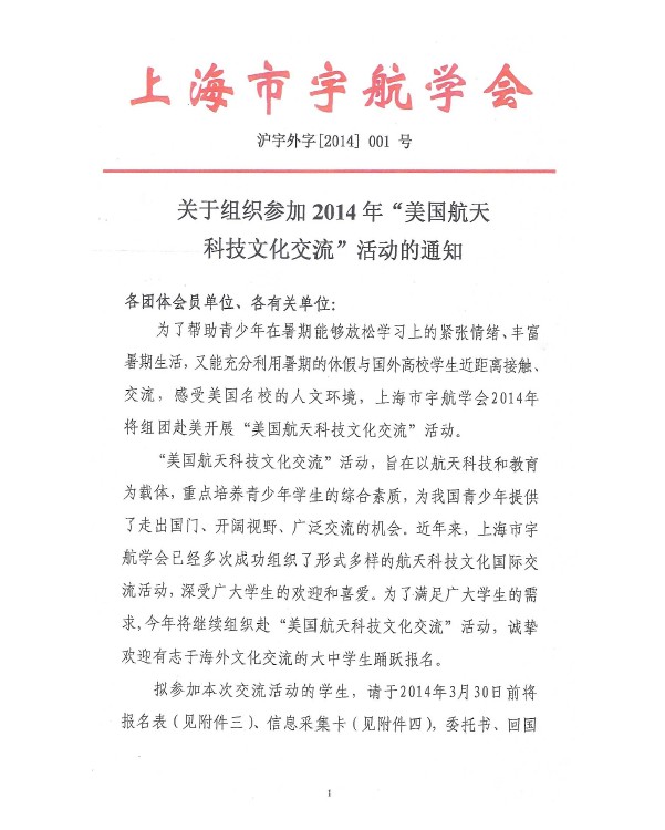 通知公告 学校首页 > 通知公告 > 通知公告 关于组织参加2014年“美国航天科技文化交流”活动的通知 作者:浏览:时间:2014-03-04 附件: 附件一至附件四为2014美国航天科技文化交流活动日程安排及相关表... 附件: 附件五:美国航天科技文化交流活动简介 map