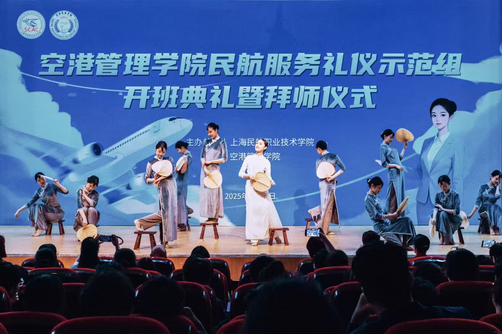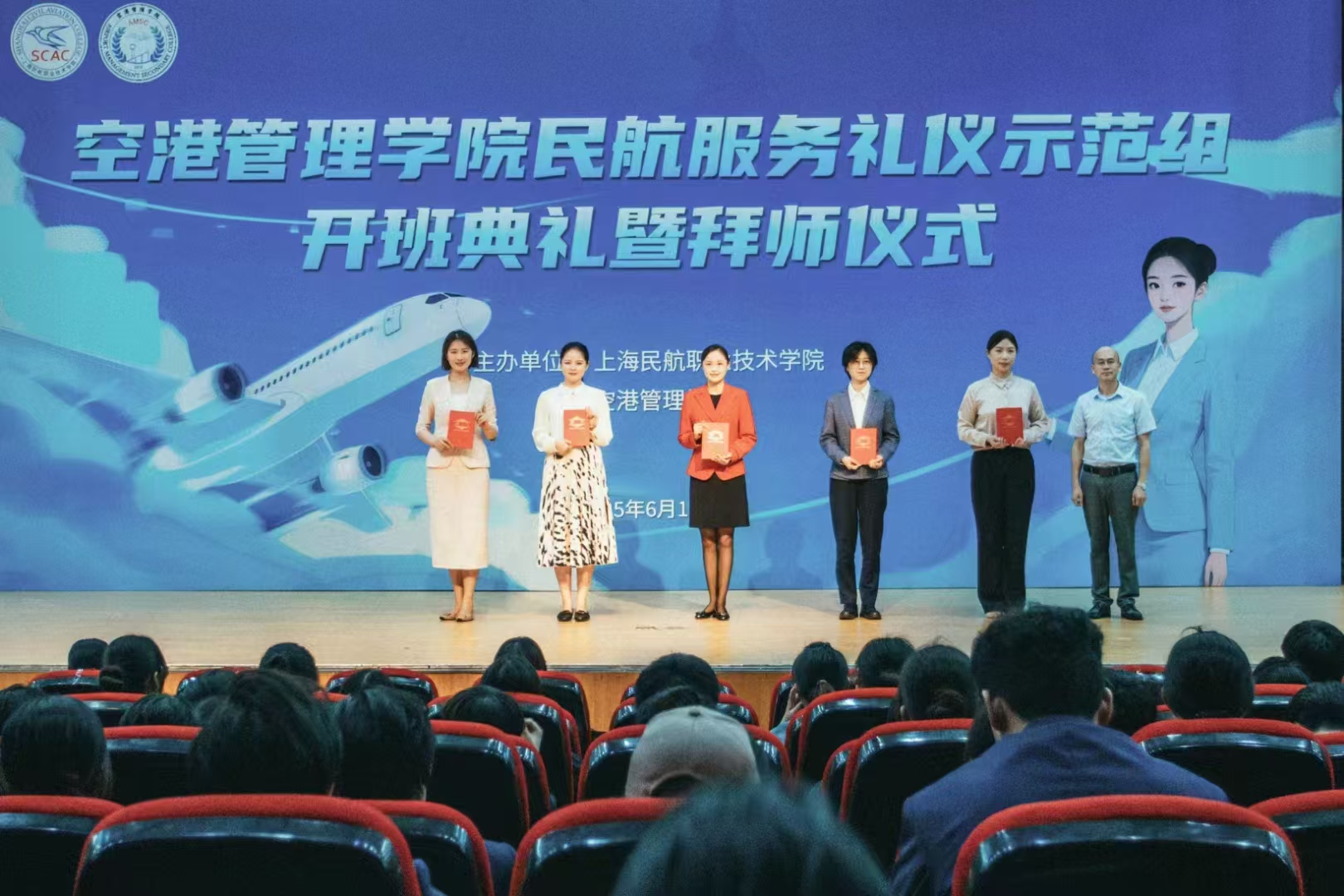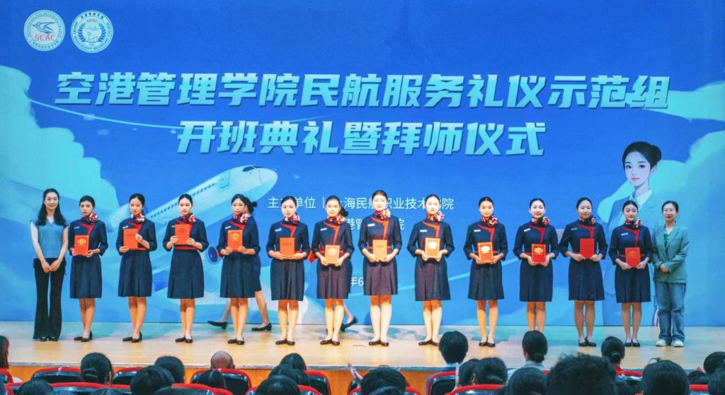 6月13日下午,空港管理学院民航服务礼仪示范组开班典礼暨拜师仪式在浦东新区尚智堂举办。北外滩经营管理有限公司(世界会客厅)培训经理邱维丽,上海上勤高级楼宇有限公司会务工作室主理人米慧卿,浦东国际机场航站区管理部旅客服务科现场问讯班组长蔡妍婷,中华职业学校航空大类专业负责人董慧,上海民航职业技术学院副院长罗玉梅,空港管理学院党总支书记、院长孙军,党总支副书记柏婷,民航乘务学院骨干教师李欣,民航服务礼仪示范组负责老师吴宗慧,空港管理学院相关教师、教研室主任、学工办主任、科室牵头人、辅导员老师等出席本次活动。