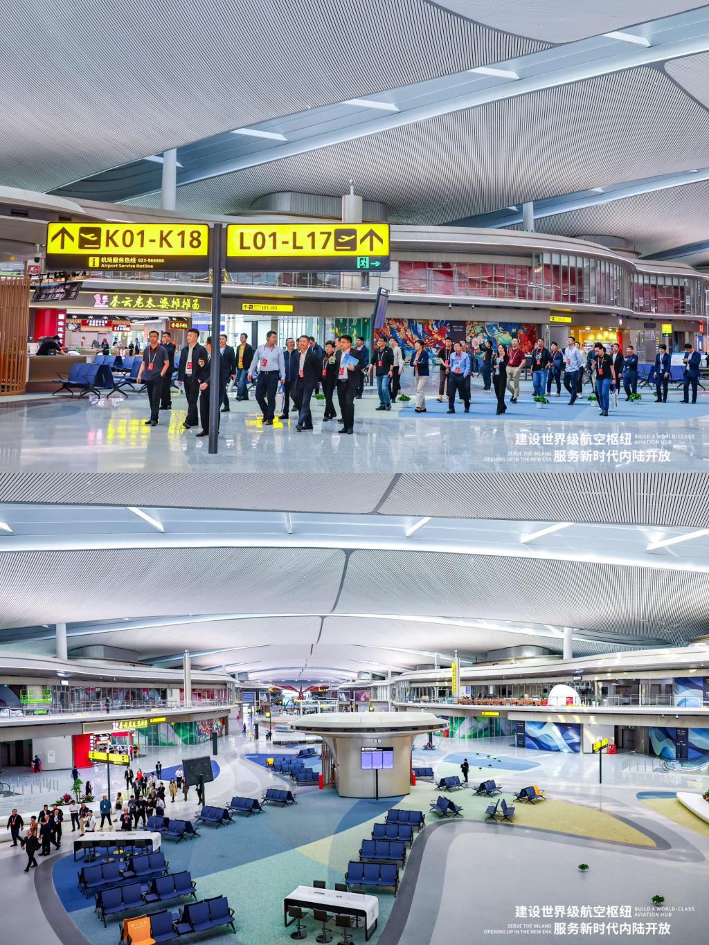 4月8日,参会人员实地考察重庆江北国际机场T3B航站楼,新航站楼为“X”构型,港湾开阔,近机位充足,是同类型卫星厅中单机位建筑面积最小,最高效的设计。室内空间开敞,充满未来感。彰显四型机场建设理念。航站楼也积极响应民航局关于民用机场航空观景设施规划建设指南,设置了室外观景平台,将机场飞行区运行全景开放于民。