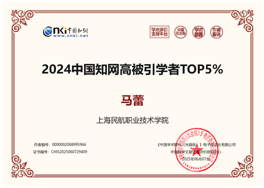 近日,中国知网下属的中国科学文献计量评价研究中心(简称“知网评价中心”)公布了2024年中国知网高被引学者名单。上海民航职业技术学院马克思主义学院教师马蕾入选“2024中国知网高被引学者TOP5%”榜单。“2024中国知网高被引学者TOP5%”是指在学术影响力排名中位列前5%的杰出研究者。知网评价中心基于中国知网收录的近十年国内学术论文,2024年首次开展学者学术影响力客观评价,遴选了“2024中国知网高被引学者”名单。“中....